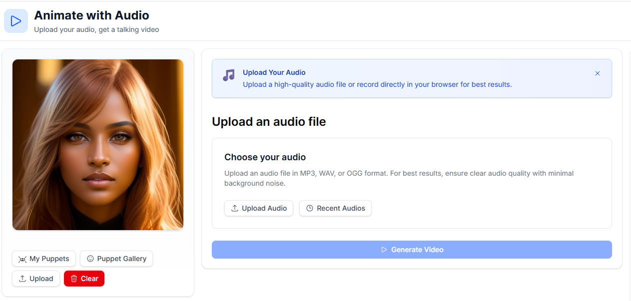 With Puppetry AI, users don’t only get to animate an image with voice but also generate audio, perfect for those who love to generate voice and audio, then animate it for presentations, explainers, and so on.
