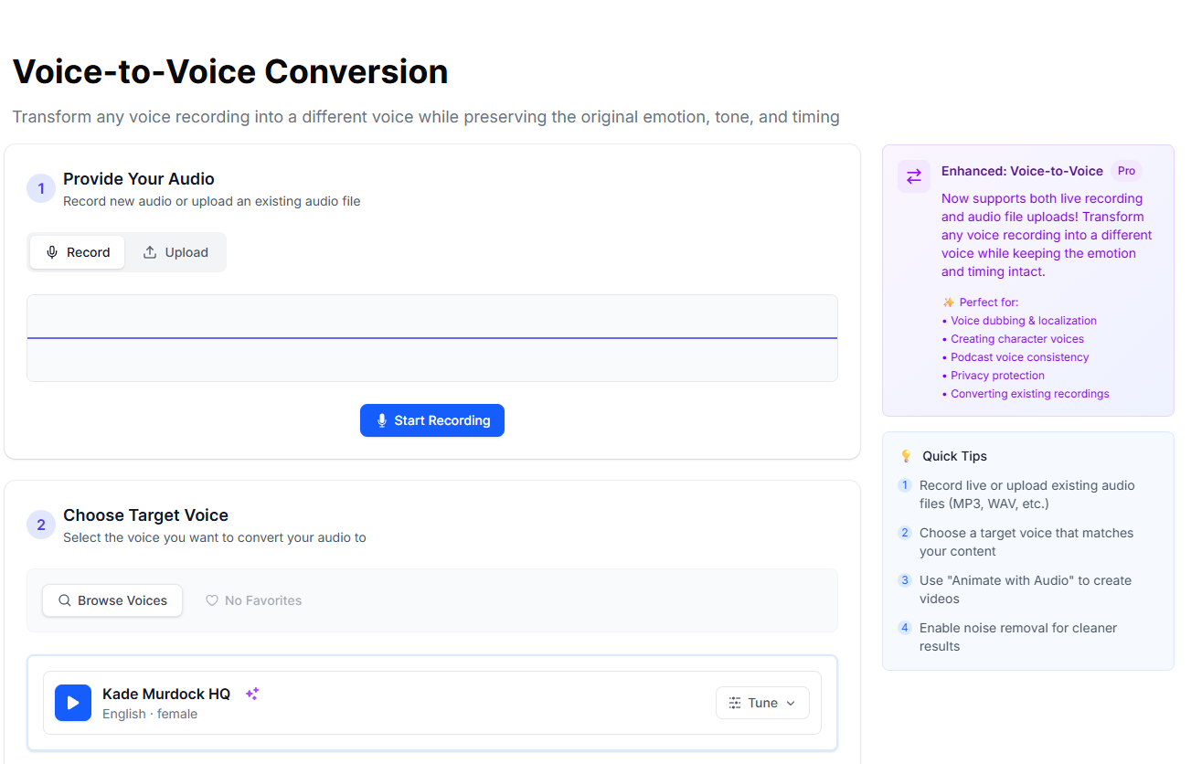 This AI voice changer lets you transform a recording into a different voice without losing timing, delivery, and emotion.