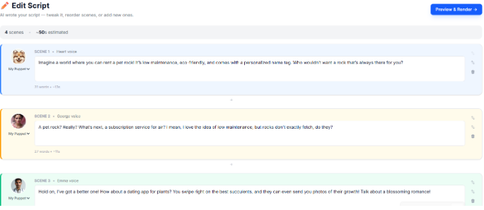 - Choose a topic (a trending idea or your own), and AI will create a multi-scene script for you.