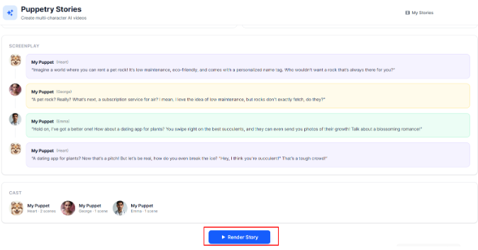 Generate a fun and engaging script via web-grounded AI research, automatically assign characters (and their dialogue), use voices from Puppetry AI’s hundreds of AI voices, and then animate every scene with lip-synced visuals. All these things make AI Stories one of the most reliable automated video content creation tools today.